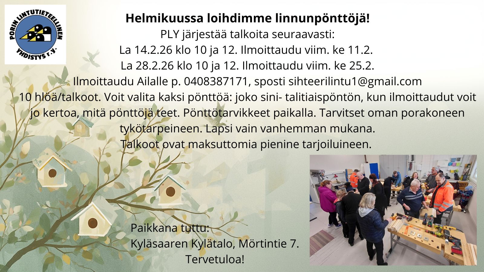 Kuhunkin otetaan 10 hlöä/talkoot. Voit valita kaksi pönttöä: joko sini- tai talitiais pöntön, kun ilmoittaudut, voit jo kertoa, mitä pönttöjä teet. Pönttötarvikkeet paikalla. Tarvitset oman porakoneen tykötarpeineen. Lapsi vain vanhemman mukana.