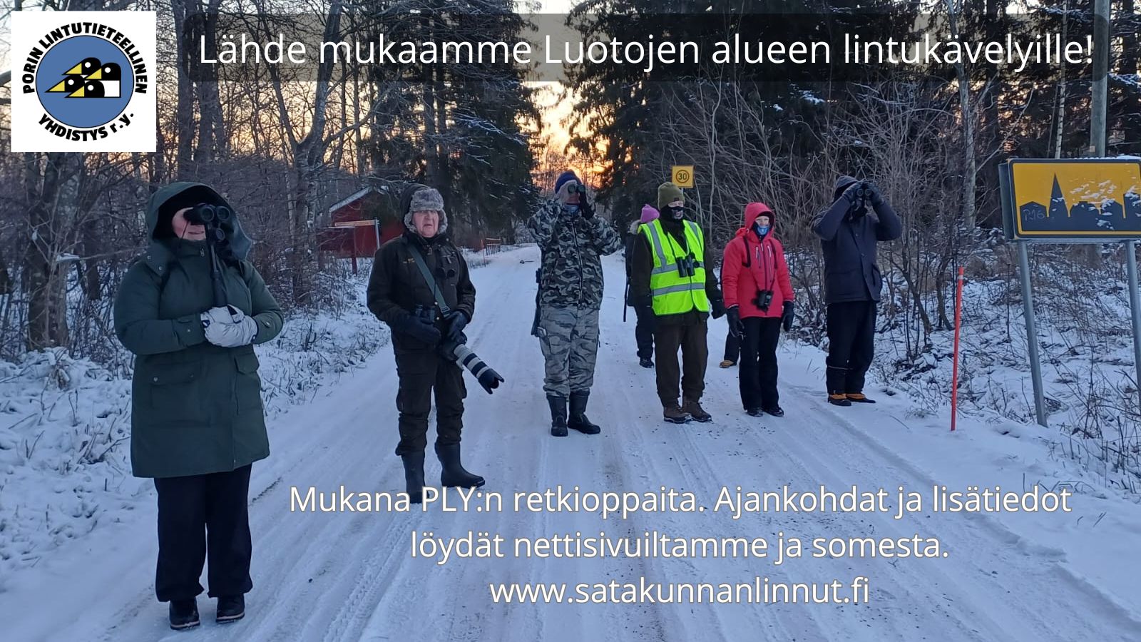 Lähtö Porin Kirjurinluodon asfaltti P-paikalta. Retken tarkoitus on havainnoida ja tunnistaa lintuja luotojen alueelta. Kävelyn pituus on n.3 km , aikaa tämän reitin kulkemiseen kuluu noin 3h. Mukana on PLY:n retkioppaita ja mahdollisuus lainata retken ajaksi kiikareita. Sään mukainen varustus ja jalkineet, koska kuunteleminenkin on tärkeää, vältäthän kahisevia ulkovaatteita. Tule reippaalla mielellä mukaan nauttimaan talven luonnosta!