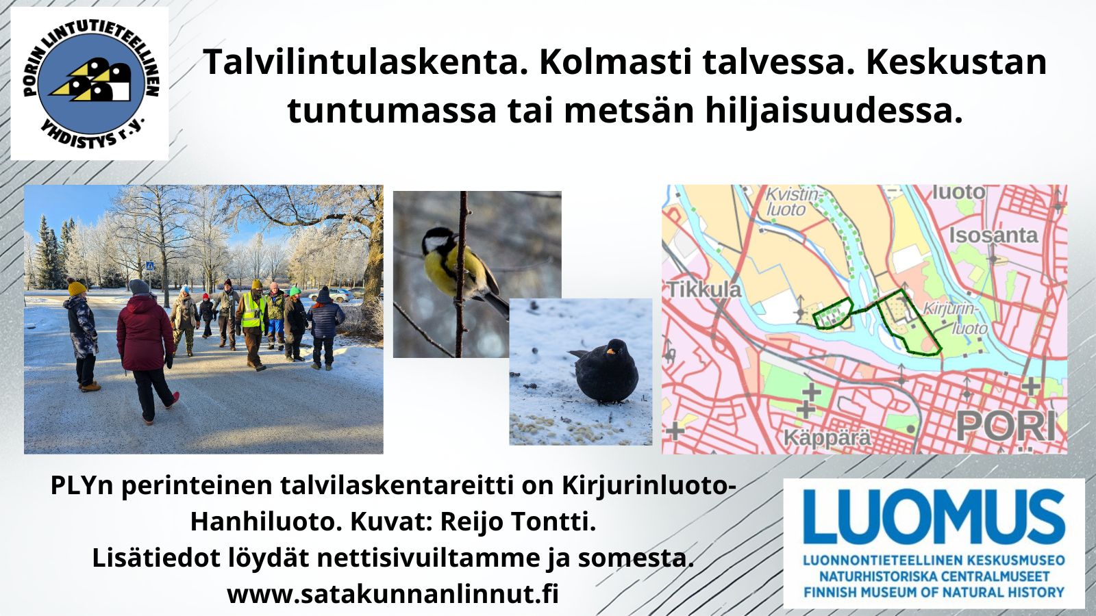 Talven kaksi ensimmäistä talvilintulaskentaa on tehty ja viimeisen aika on juuri meneillään. Kutsumme sinutkin mukaan laskentoihin, katso viestimme ao kuvaa klikkaamalla!