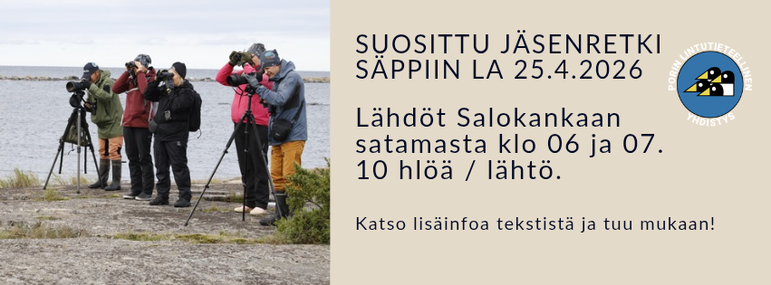 Retkelle otetaan max. 50 henkilöä ilmoittautumisjärjestyksessä. Lähtö la 11.4. klo 8.00 yhteiskuljetuksella Luontotalo Arkin edestä (Pohjoispuisto 7).