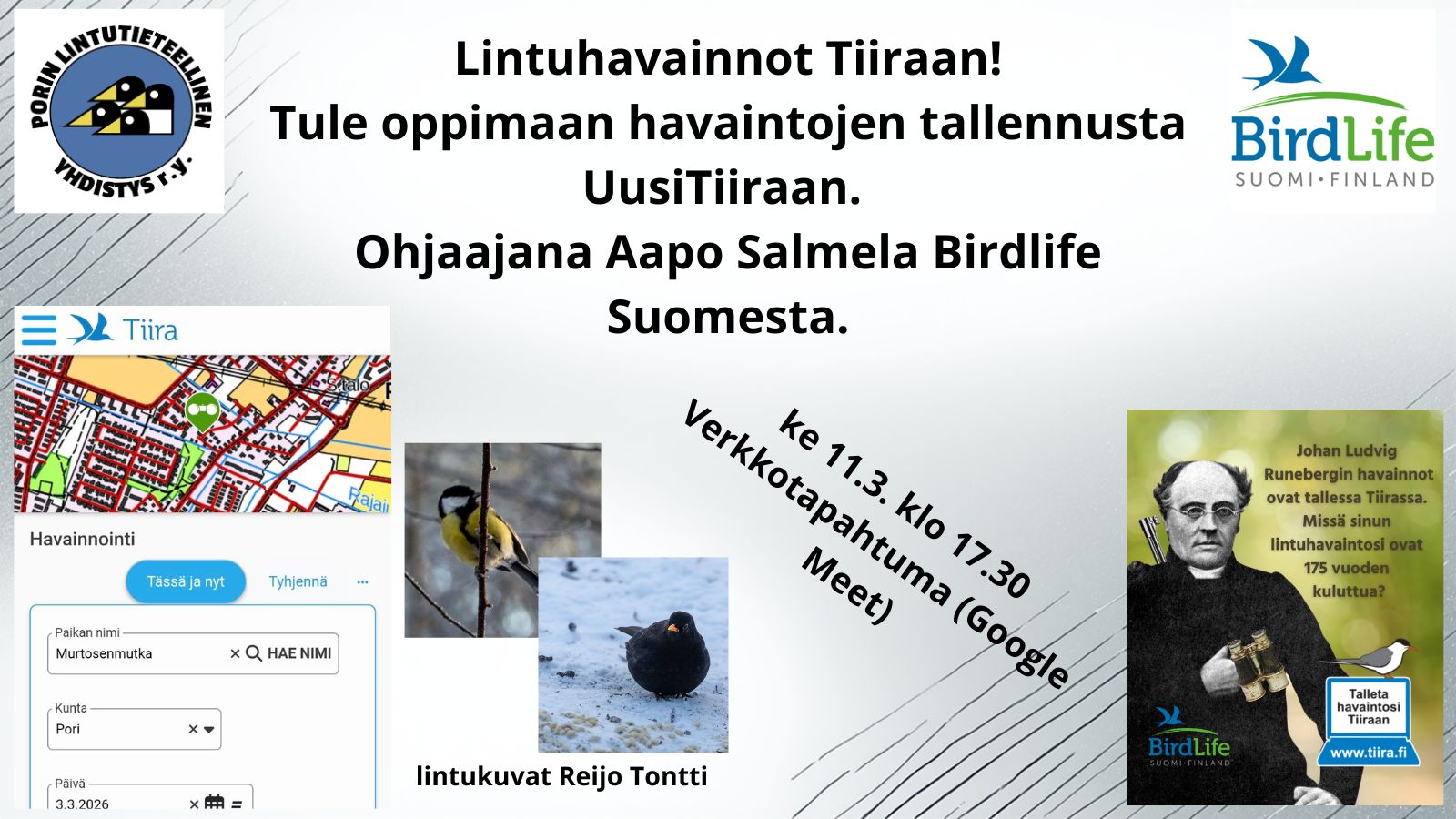 Tule mukaan oppimaan, kuinka tallennat lintuhavaintosi UusiTiiraan. Ohjaajana Aapo Salmela Birdlife Suomesta. Esitystä ei tallenneta, mutta esitysmateriaalin saamme käyttöömme.