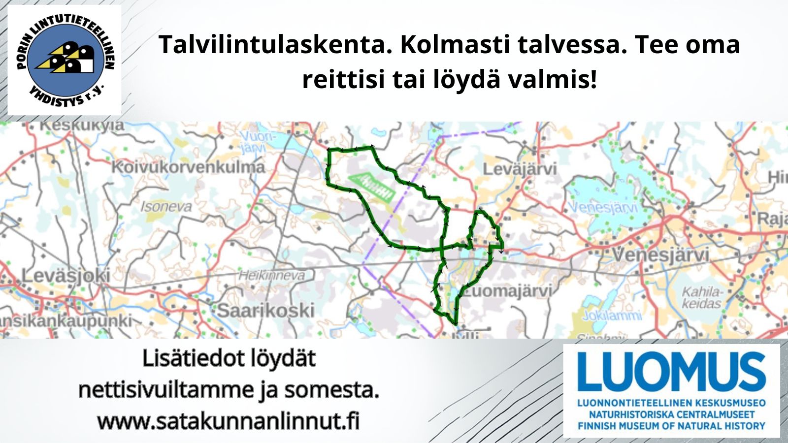 PLYn alueella on elvytetty vanhoja reittejä ja luotu myös uusia – kiitos näistä. Talvilintulaskennoista kertyvä tieto on Luomuksen tietokannassa vain reitin ja elinympäristön tarkkuudella. Vähintäänkin parhaat havainnot tarkkoine paikkoineen kannattaa tallentaa myös Tiiraan. Mikäli mietit talvilaskennan aloittamista, kysele rohkeasti neuvoa Ailalta p.040-8387171.
