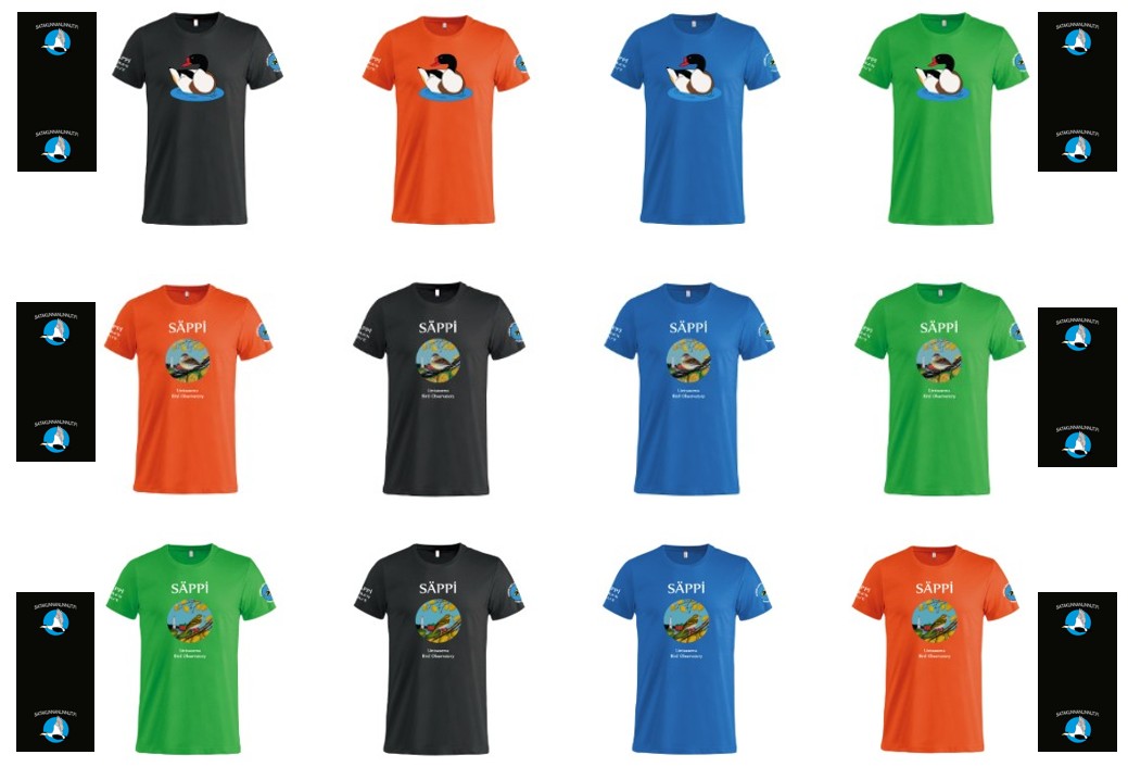 Teepaidoissa on neljä värivaihtoehtoa niin aikuisille kuin lapsillekin, saatavana kolmella eri logolla: ristisorsa, Säppi kastanjasirkku ja Säppi taigakirvinen, vasemmassa hihassa on PLYn logo.